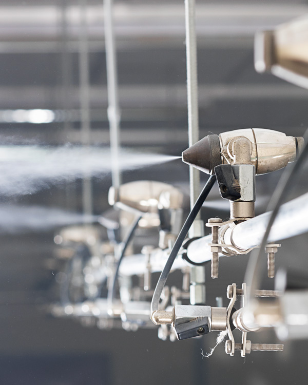 The Condair JetSpray system was selected and installed at the manufacturing plant in Kempsey, NSW. The system incorporates 18 nozzles, each capable of introducing 3.5 litres of moisture per hour into the atmosphere. A wall-mounted JetSpray control panel regulates a supply of compressed air and water, which is provided to the nozzle lines. Each nozzle perfectly combines the air and water to release extremely fine aerosols, with droplet sizes of just 7.5 microns, which rapidly evaporate into the air. The compressed air prevents any possibility of drips from the nozzles and makes the spray highly directional, thus preventing wetting on machinery, walls or the floor.